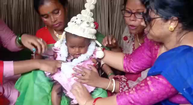 রমা চ্যাটার্জি, দক্ষিণ দিনাজপুরঃ নাম তার লক্ষী। ২৬ জানুয়ারি প্রজাতন্ত্র দিবসের দিন গোটা দেশ যখন আনন্দে মশগুল, ঠিক তখন লক্ষী জন্মের পড়েই হাসপাতালের বিছানায় মাতৃহারা হয়! পিতা নিরঞ্জন হাঁসদা গরীব আদিবাসী দিনমজুর!দিন আনা দিন খাওয়া ঘরে জন্মের পর থেকেই মা হারা লক্ষী। কিন্তু মা’ না থাকলেও মায়ের দুধের অভাব বুঝতে দেয়নি এলাকার পতিরাম নাগরিক ও যুব মঞ্চের মামা’রা। বিগত ছয় মাস ধরে ল্যাক্টোজেন দুধের প্যাকেট নিয়ে লক্ষীর জন্য হাজির থেকেছে পাড়াতুতো এই মামারা। শুধু তাই নয় তাকে দেখভালের পাশাপাশি কাজ হারিয়ে ঘরে বসে থাকা তার বাবার খাদ্য খাবারও জুগিয়ে গেছে মাসভর তার এই মামাাারর। সেই পতিরাম নাগরিক সমাজ ও যুব সমাজ মঞ্চের মামারাই আজ তাদের আদরের লক্ষী ছয় মাসে পা দিতেই মেতে উঠলো আদরের ভাগ্নী লক্ষীর অন্নপ্রাসনে।