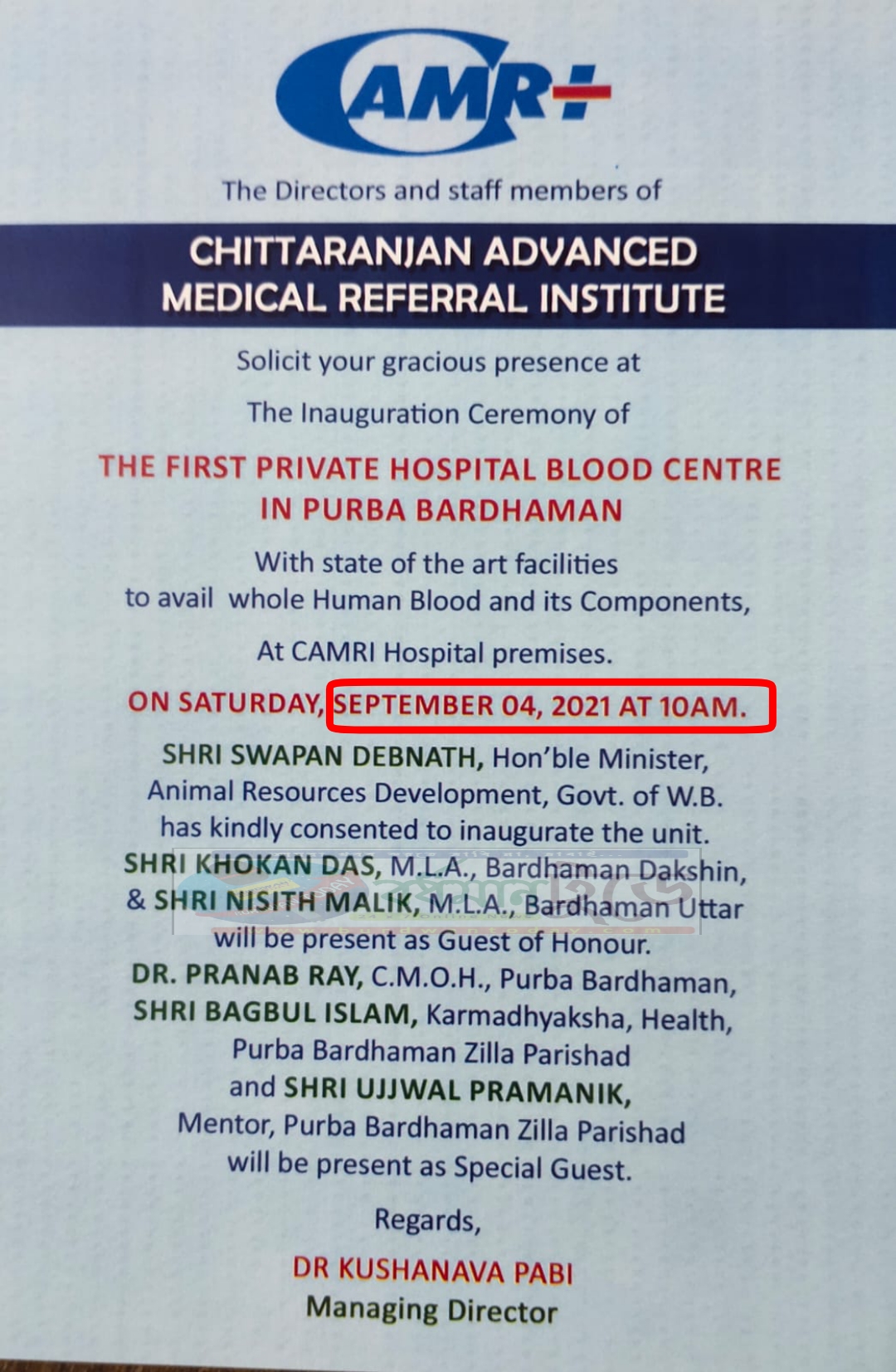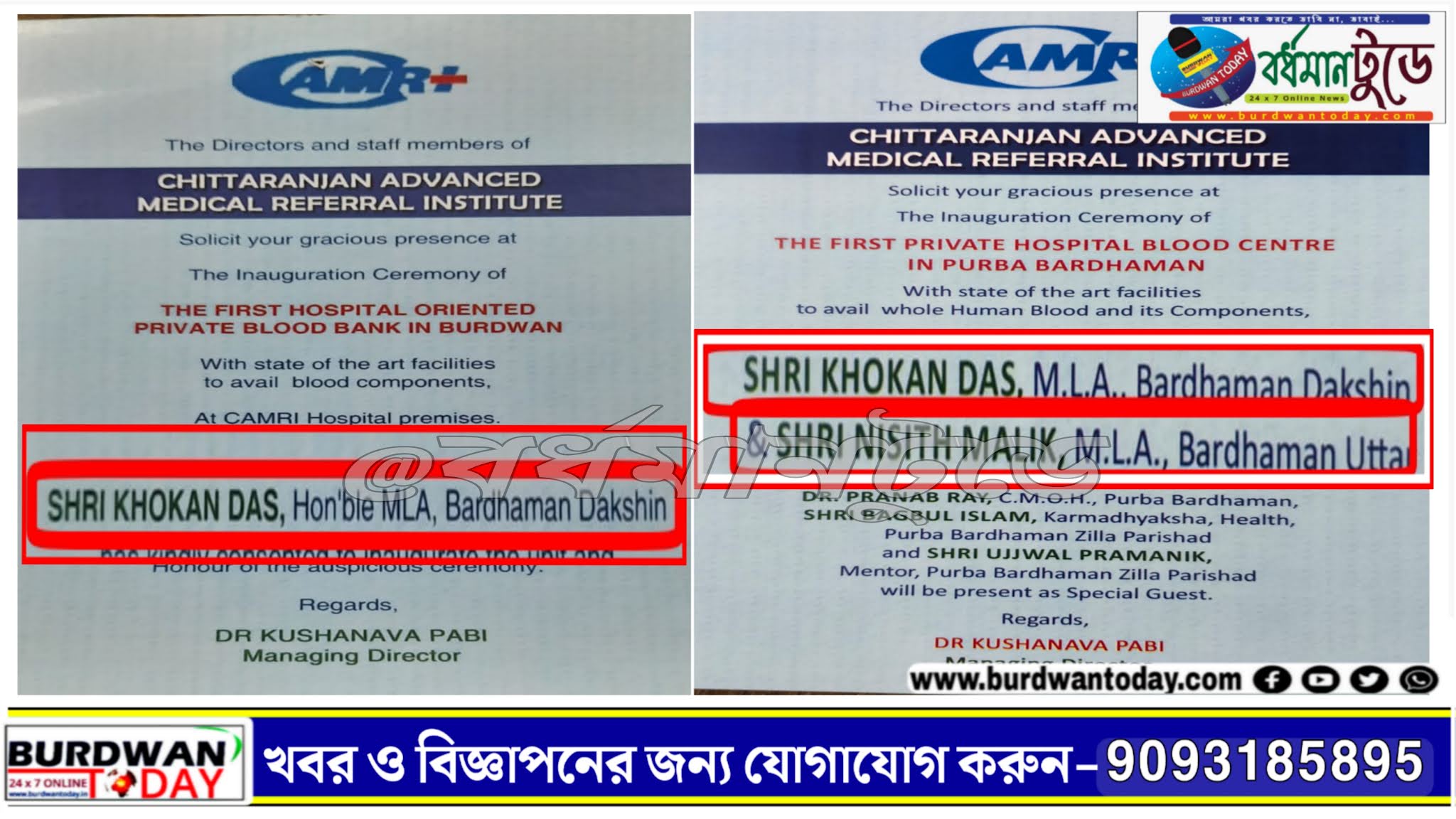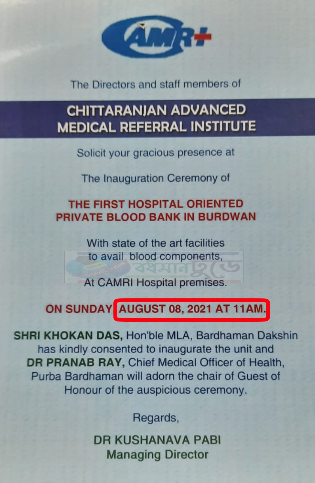 সব্যসাচী সান্যাল, বর্ধমানঃ উদ্বোধন হওয়ার কথা ছিল ৮ আগস্ট। বর্ধমান দক্ষিণ বিধানসভা কেন্দ্রের বিধায়ক খোকন দাস ক্যামরী হাসপাতালের বেসরকারি উদ্যোগে তৈরি ব্লাড উদ্বোধন করার কথা ঘোষণা করে আমন্ত্রণ পত্র বিলিও করে দেওয়া হয়।কিন্তু সেই আমন্ত্রণ পত্রে স্থানীয় (বর্ধমান উত্তরের) বিধায়ক নিশীথ মালিকের নাম না থাকায় । নিশীথ বাবুর অনুগামীরা তীব্র ক্ষোভ প্রকাশ করেন । তাদের কথায় আমাদের এলাকায় হাসপাতাল তার ব্লাড ব্লাড ব্যাঙ্কের উদ্বোধন হবে এবং তা করবে খোকন দাস আর আমাদের বিধায়ক বাদ যাবে। বিক্ষোভ এবং পরবর্তী ঝামেলার আশঙ্কা উপলব্ধি করে । হাসপাতাল কর্তৃপক্ষ উদ্বোধনী অনুষ্ঠান পর্ব পিছিয়ে দেয় এর পরই কিছু দিনের মধ্যে নতুন আমন্ত্রণ পত্র ছেপে বিলি করে ।