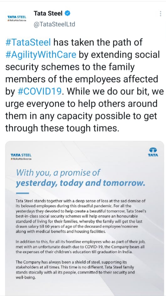 টুডে নিউজ সার্ভিসঃ বর্তমান করোনাকালে আমরা বহু মানুষ ও প্রিয় জনকে হারিয়েছি। এমত অবস্থায় টাটার কর্মচারীদের জন্য সংস্থার পক্ষ থেকে এক টুইট বিবৃতিতে বলা হয়েছে, করোনায় কোনো কর্মচারীর মৃত্যু হলে টাটা স্টিলের পক্ষ থেকে ৬০ বছর বয়স পর্যন্ত তাঁর পরিবারকে দেওয়া হবে পূর্ণ মাসিক বেতন ও অন্যান্য সুযোগ সুবিধা।
