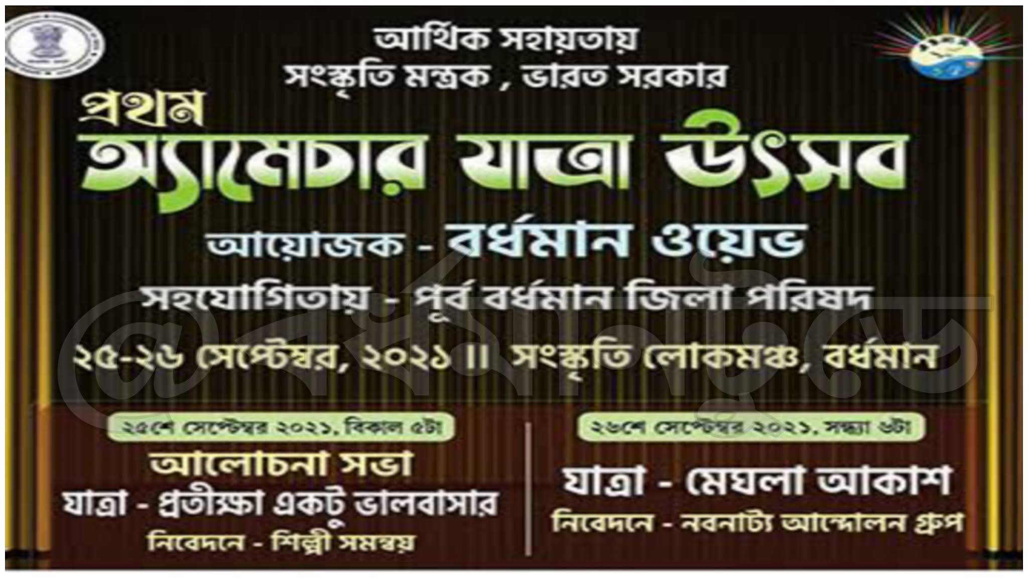 মঙ্গলবার, বর্ধমান কালেকটরেট রিক্রিয়েশন ক্লাবে এক সাংবাদিক সম্মেলন করা হয় সংস্থার তরফে। জেলায় অ্যামেচার বা অপেশাদার যাত্রা উৎসব এই প্রথম। প্রথম বছরের এই উৎসবে থাকছে শহরের দুটি যাত্রাদলের দুটি যাত্রাপালা। ২৫ তারিখ থাকছে শিল্পী সমন্বয়ের যাত্রাপালা ‘প্রতিক্ষা একটু ভালোবাসার’। ২৬ তারিখ থাকছে নবনাট্য আন্দোলন গ্রুপের যাত্রাপালা ‘ মেঘলা আকাশ’।