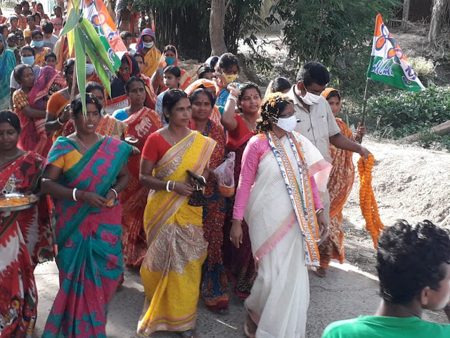 ভোটারদের আগ্রহ দেখে মুখের হাসি চওড়া হচ্ছে সাঁইথিয়া বিধানসভার ঘাসফুলের প্রার্থী নীলাবতি সাহার। প্রখর গরমে যখন হাঁটাই কষ্টকর তখন কাঁদে ঢাক নিয়ে মাথায় তৃণমূলের টুপি পড়ে অবলীলায় ঢাক বাজিয়ে হেঁটে চলেছেন ঢাকিদের দল। ভোটাররাও তাদের দেখে বেশ নতুনত্ব পাচ্ছে। ভোটের প্রচারে ঢাকের শব্দ এনে দিয়েছে উৎসবের টাটকা গন্ধ।