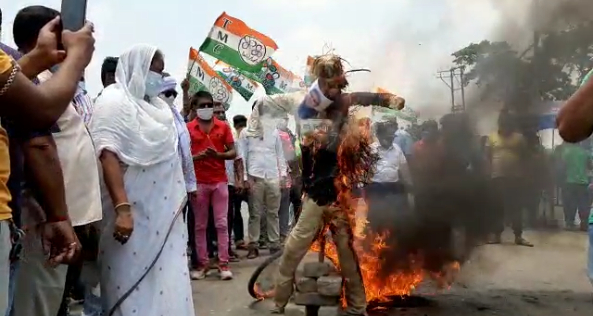 নিখিল কর্মকার, নদীয়াঃ রাজ্যপালের নির্দেশে বেআইনিভাবে ক্যাবিনেট মন্ত্রীদের গ্রেফতার করা হয়েছে, অবিলম্বে রাজ্যপালের পদত্যাগ চাই আমরা, মূলত এই দাবি নিয়ে রাজ্যপালের কুশপুতুল জ্বালিয়ে নদীয়ার ফুলিয়ায় ৩৪ নম্বর জাতীয় সড়ক অবরোধ করে বিক্ষোভ দেখালো তৃণমূল কংগ্রেস সমর্থকরা। এছাড়াও নদীয়ার বিভিন্ন জায়গাতেও এদিন বিক্ষোভ দেখালেন তৃণমূল কর্মী সমর্থকরা। উপস্থিত ছিলেন নদীয়া জেলার তৃণমূল কংগ্রেসের জেলা পরিষদের সভাধিপতি রিক্তা কুন্ডু। উল্লেখ্য সোমবার সিবিআই তৃণমূল কংগ্রেসের শীর্ষ নেতাকে বাড়ি থেকে গ্রেফতার করে। সিবিআই এর দাবি নারদ কান্ডে তাদের গ্রেফতার করা হয়েছে। এরপরে কলকাতা সহ গোটা রাজ্য জুড়ে বিক্ষোভ দেখাতে থাকে তৃণমূল কংগ্রেস। যদিও পরবর্তীকালে তাদের জামিন মঞ্জুর হলেও হাইকোর্ট জামিন মঞ্জুরের স্থগিতাদেশ জারি করে। এর পরে আবারো উত্তপ্ত হয়ে ওঠে গোটা রাজ্য রাজনীতি।গোটা রাজ্য জুড়ে তৃণমূল কংগ্রেসের কর্মীরা রাস্তায় অবরোধ কুশপুতুল জ্বালিয়ে বিক্ষোভ দেখাতে থাকে।এদিন নদীয়ার ফুলিয়ার ৩৪ নম্বর জাতীয় সড়ক অবরোধ করে রাজ্যপাল জগদীপ ধনকর-এর একটি কুশপুতুলে জ্বালিয়ে বিক্ষোভ দেখায় তারা। তৃণমূল কংগ্রেসের দাবি যতক্ষণ না পর্যন্ত রাজ্যপাল পদত্যাগ করছেন আমাদের আন্দোলন চলতে থাকবে।এছাড়াও শান্তিপুর সহ নদিয়ার একাধিক জায়গায় টায়ার ও কুশপুতুল দাহ করে প্রতিবাদ বিক্ষোভ করেন তৃণমূল সমর্থকরা।