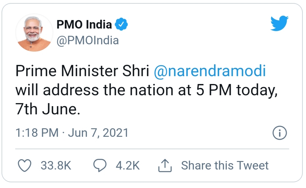 টুডে নিউজ সার্ভিস, নয়াদিল্লিঃ ৭ জুন সোমবার বিকাল ৫টায় জাতির উদ্দেশ্যে ভাষণ দেবেন প্রধানমন্ত্রী নরেন্দ্র মোদি। প্রধানমন্ত্রীর অফিস থেকে টুইট করে লেখা হয়েছে, ‘৭ জুন বিকাল ৫টায় জাতির উদ্দেশ্যে ভাষণ দেবেন প্রধানমন্ত্রী।’