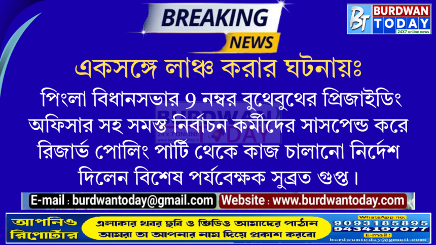 টুডে নিউজ সার্ভিস ,মেদিনীপুরঃ পশ্চিম মেদিনীপুরের পিংলা বিধানসভার পিংলা বিধানসভার 9 নম্বর বুথে প্রিসাইডিং অফিসার সহ সব নির্বচন্কর্মির একসঙ্গে লাঞ্চ করতে বুথ ছেড়ে বেরিয়ে যান। বুথ থেকে নিরাপত্তা কর্মীরা তাদেরকে ফোন করলে বলা হয় আমরা বাইরে আছি পরে আসছি। সেক্টর অফিসারও বাইরে ছিলেন বলে খবর। এই খবর পাওয়া মাত্র পশ্চিম মেদিনীপুরের জেলা নির্বাচনী আধিকারিক কে গোটা ঘটনা তদন্তের নির্দেশ দেওয়া হয়। ওই বুথের প্রিজাইডিং অফিসার সহ সমস্ত নির্বাচন কর্মীদের সাসপেন্ড করে রিজার্ভ পোলিং পার্টি থেকে কাজ চালানো নির্দেশ দেন বিশেষ পর্যবেক্ষক সুব্রত গুপ্ত।